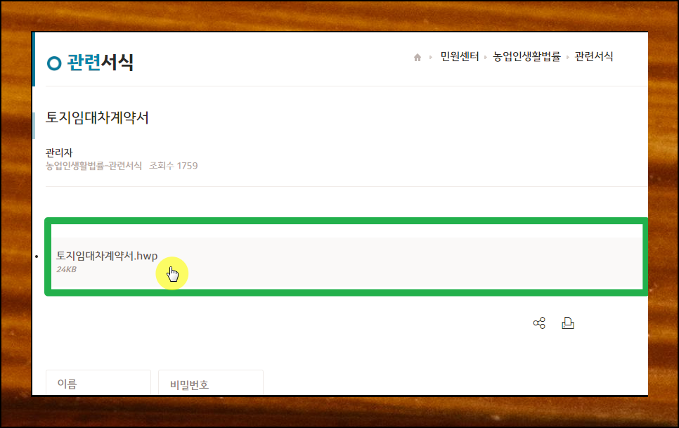 자료 게시판에서 필요한 임대차 서류의 제목을 선택하면 아래아한글(hwp) 파일로 즉시 내려받을 수 있습니다. 토지 계약 문서도 이 방식으로 안전하게 확보하여 사용할 수 있어요.