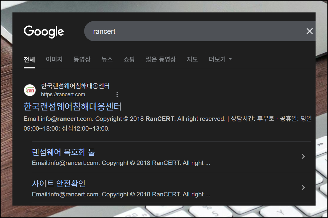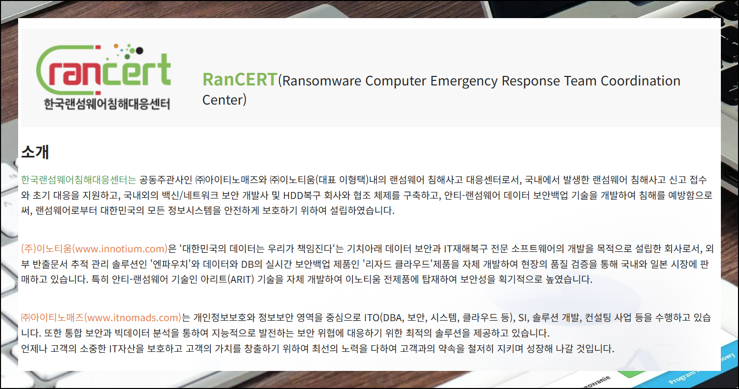 Rancert 대응센터는 보안 솔루션을 제공하는 곳으로 이쪽 분야에서 신뢰할 수 있는 곳입니다. 이름에 '한국'이 포함되어 있어 공공기관처럼 보이지만, 정확한 소속은 파악하지 못했어요.