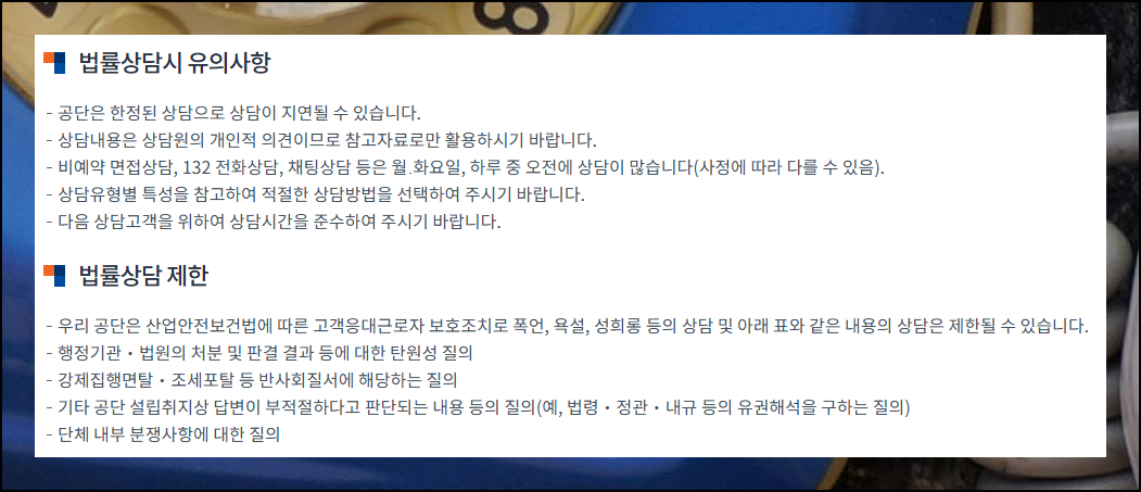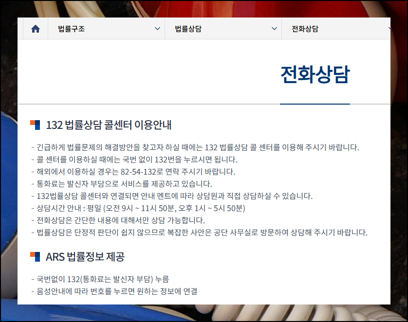 긴급하게 법적 고민이 생겼다면 132번로 전화를 걸어보세요. 무료로 전문가 상담을 받을 수 있습니다. 서비스 이용은 무료에 해당이 되지만, 통화료는 본인 부담이에요.