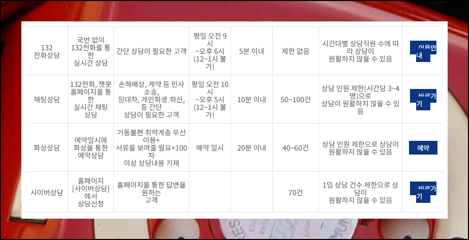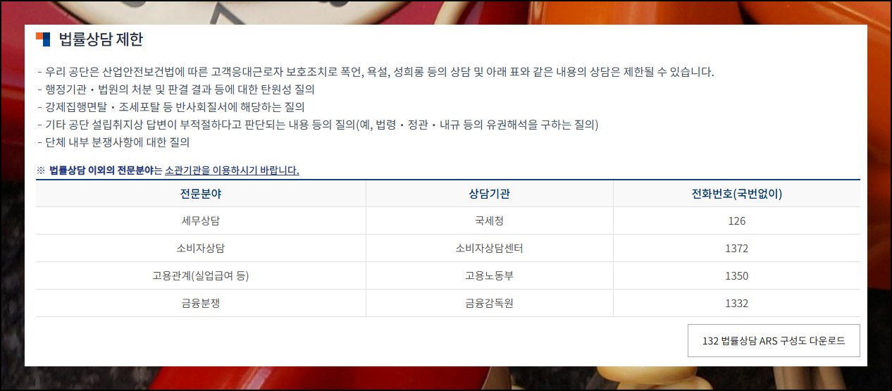 긴급하게 법적 고민이 생겼다면 132번로 전화를 걸어보세요. 무료로 전문가 상담을 받을 수 있습니다. 서비스 이용은 무료에 해당이 되지만, 통화료는 본인 부담이에요.