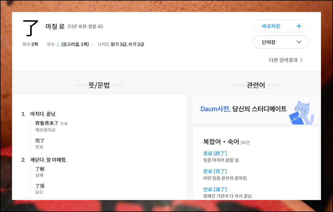 예를 들어 "마칠 료, 밝은 료"를 클릭하면 더 자세한 정보 페이지로 이동할 수 있습니다. 검색기를 통해 얻을 수 있는 정보는 생각보다 풍부해요.