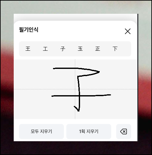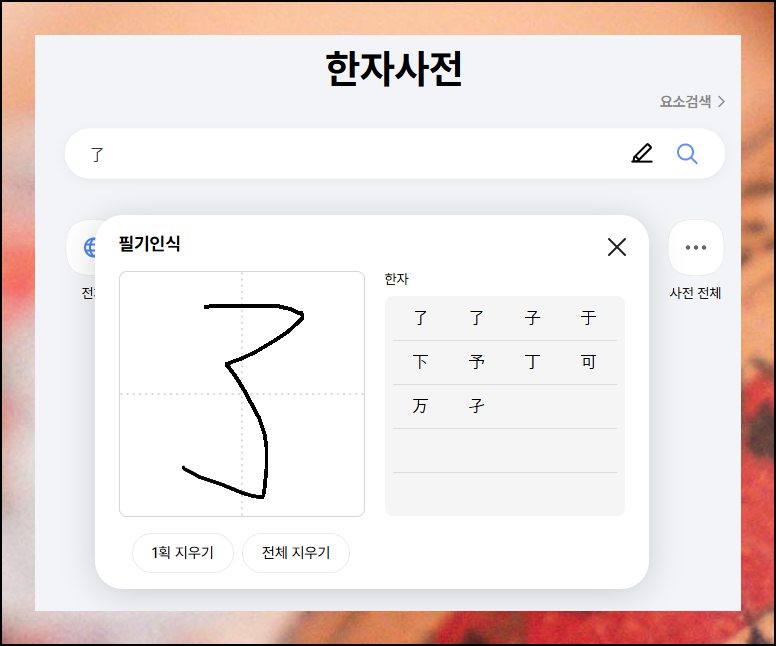 검색 버튼 옆에 있는 "필기" 모양의 아이콘을 클릭해 보세요. 필기인식 프로그램이 화면에 나타납니다. 여기에 마우스를 이용하여 찾고 싶은 한자 모양을 그려보세요.
