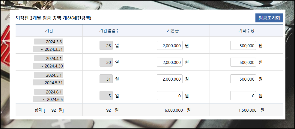 그러면 총 근무 일수가 자동으로 처리되어 나타납니다. 다음 단계에서는 최근 3개월간 받은 기본급과 제수당을 차례로 입력해주세요.