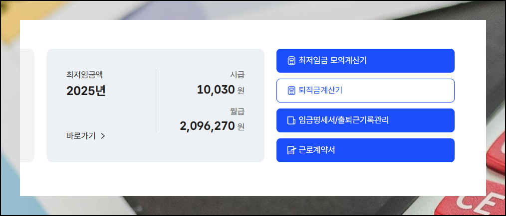 취업 정보와 직업 훈련, 노동 분쟁 해결 등 근로자를 위한 종합 서비스를 한눈에 볼 수 있어요. 페이지를 조금 내려보면 화면 오른쪽 부분에서 "퇴직금 계산기" 메뉴를 발견할 수 있습니다.