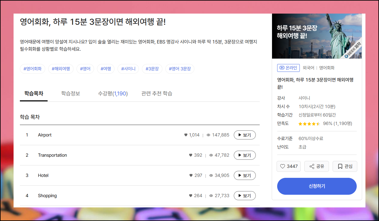 모든 강좌에는 구체적인 설명과 정보가 상세히 나와 있습니다. 예를 들어 하루 15분 영어회화 3문장 습득 과정은 총 10회차로 구성되어 있어요. 각 강의의 소요 시간과 커리큘럼을 사전에 확인할 수 있어서 개인 공부 계획 수립에 도움이 됩니다.
