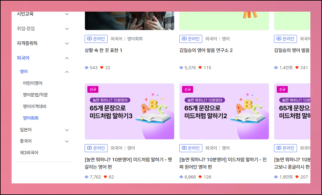 영어회화 관련 강좌가 42개나 마련되어 있습니다. 회화 연습 외에도 문법 강화나 자격증 준비를 위한 강좌도 있으니 필요할 때 이용해보세요. 좌측에 있는 메뉴에서 "영어회화"를 선택하면 회화 중심 강의만 별도로 골라 볼 수 있습니다.