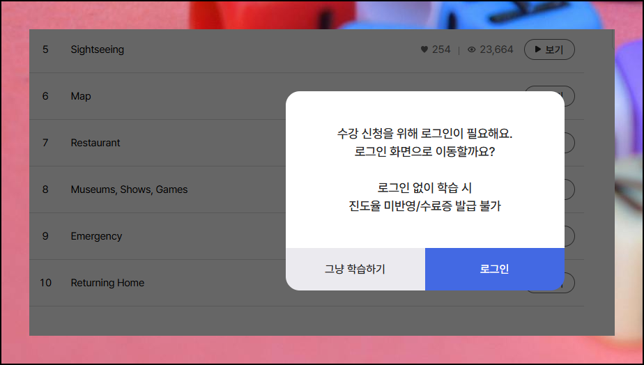 영어회화 실력을 체계적으로 관리하고 싶은 경우 회원 로그인을 권장합니다. 로그인을 통해 진도 추적과 수료증명서 발급 등의 추가 서비스를 이용할 수 있어요. 하지만 단순히 강의 수강만이 목적이라면 로그인 과정을 생략해도 됩니다.