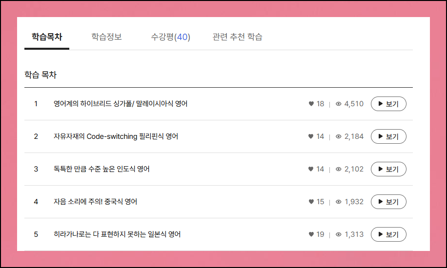 각 수업은 배우는 내용이 서로 달라서 순차적으로 듣지 않아도 괜찮습니다. 목차를 살펴보고 본인이 원하는 특정 부분만 골라서 영어회화 공부를 진행할 수 있어요. 개인만의 속도로 차근차근 실력을 발전시켜 나가면 됩니다.