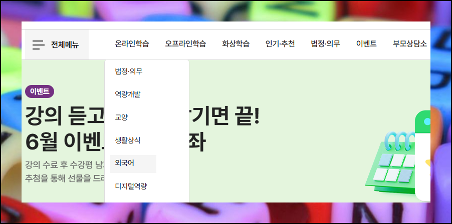 혼자하기 학습 방법은 생각보다 다양한 경로가 있습니다. 사이트 메인 화면에서 온라인학습 섹션을 클릭하면 시작할 수 있어요. 다양한 학문 분야가 제시되는데 이 중에서 외국어 카테고리를 선택하면 됩니다. 외국어 영역 안에는 영어도 포함이 되어 있어요.