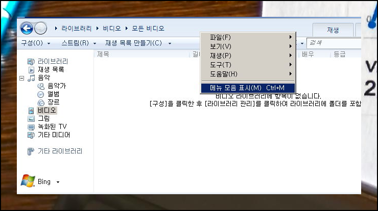 프로그램이 실행된 후에는 화면에서 비디오가 재생되지 않는 빈 공간을 찾아보세요. 그 빈 공간에서 마우스 오른쪽 버튼을 클릭하면 목록이 나타납니다. 메뉴 항목을 차례대로 살펴보면 맨 아래쪽에 "메뉴 모음 표시"라는 선택지가 있어요. 이 옵션을 클릭하면 윈도우 미디어 플레이어 프로그램 상단에 메뉴바가 나타나게 됩니다.