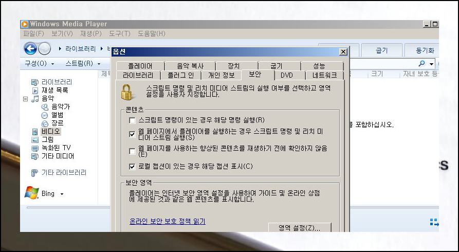 옵션 창이 열리면 여러 탭이 표시되는데, "보안" 탭을 찾아 클릭하세요. 보안 탭에서는 미디어 재생과 관련된 보안 구성을 관리할 수 있습니다. 화면을 아래로 스크롤하면 콘텐츠 관련 옵션이 나타나요. 그 중에서 "로컬 캡션이 있는 경우 해당 캡션 표시"라는 선택지를 찾아 체크박스를 클릭하여 활성화하세요.