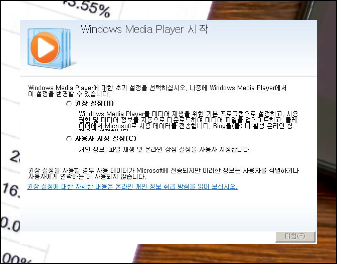 윈도우 미디어 플레이어를 처음 시작하면 구성 화면이 나타납니다. 여러 옵션 중에서 어떤 것을 선택해야 할지 고민된다면 권장 설정을 선택하세요. 이 설정을 선택하면 일반적으로 필요한 기능들이 자동으로 활성화됩니다. 복잡한 조정을 일일이 변경할 필요 없이 바로 윈도우 미디어 플레이어 프로그램을 사용할 수 있어요.