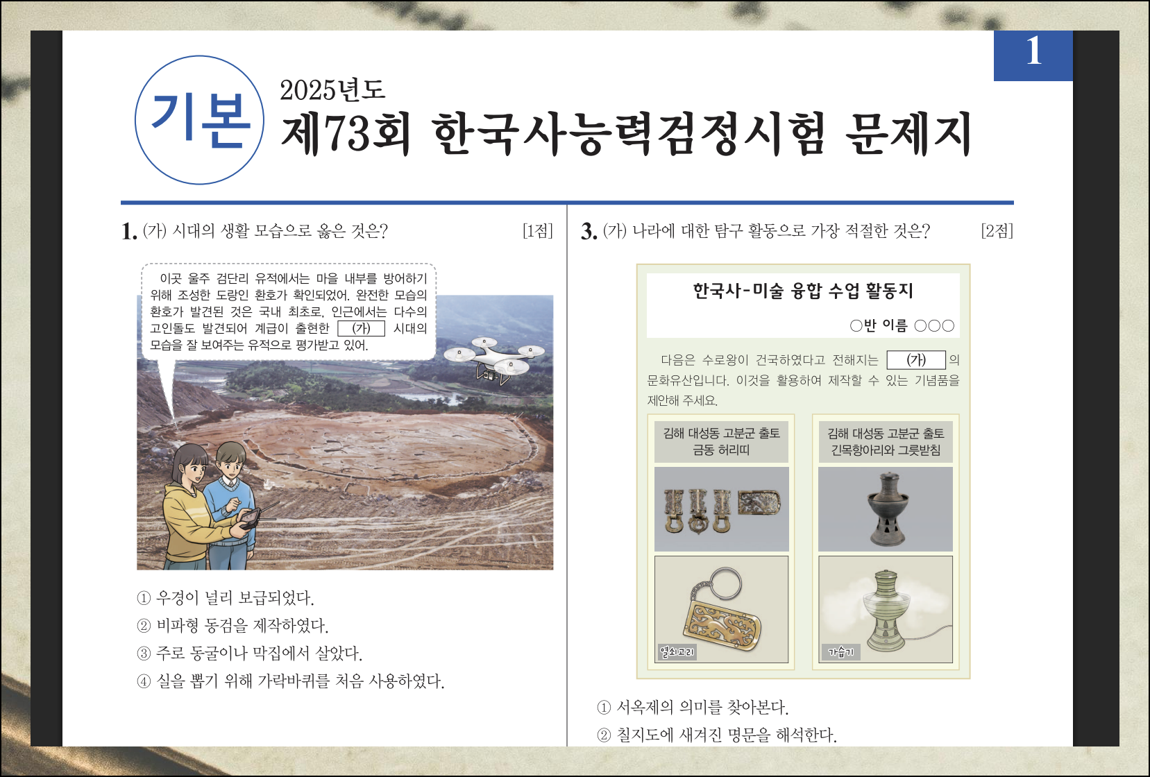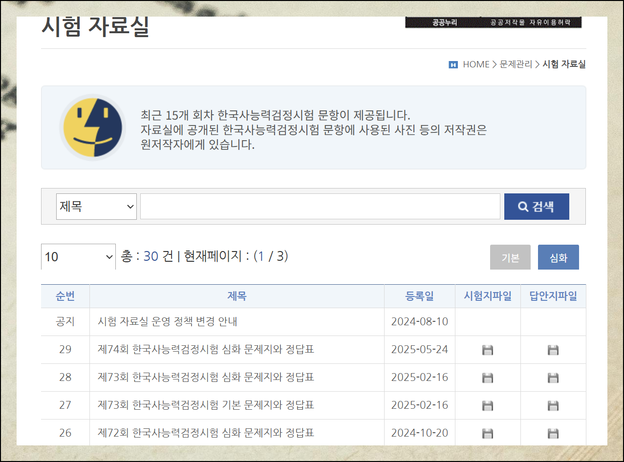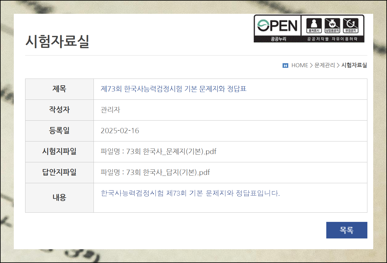 73회차 한국사능력검정시험 기본 수준에 해당하는 자료를 예시로 살펴보겠어요. 문제와 해답지 파일 모두 pdf 포맷으로 제공됩니다.