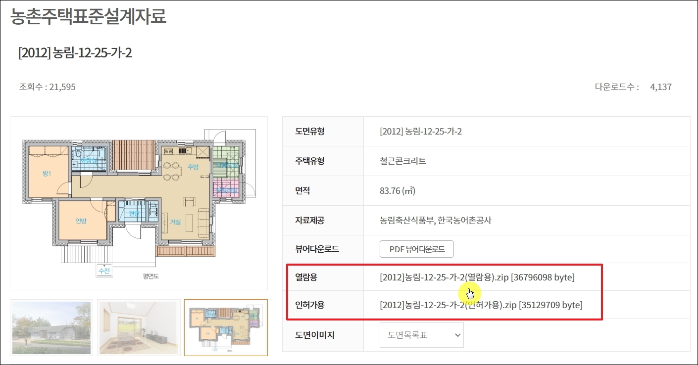 ▼게시물을 선택하면 앞서 언급한 열람용, 인허가용 자료 파일을 다운로드 받을 수 있도록 되어 있습니다. zip 파일로 압축이 되어 있기 때문에 알집이나 반디집과 같은 프로그램을 이용하여 압축을 해제해서 사용하면 됩니다.
