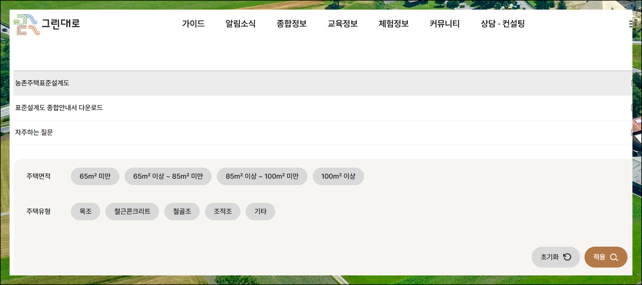 건설하려는 농가주택의 규모와 건축방식에 맞춰 수 십 종류의 표준설계도 자료를 둘러볼 수 있어요. 규모 측면에서는 65제곱미터 미만의 소형부터 100제곱미터 이상의 대형까지 선택 가능해요. 건축방식은 목조와 조적조, 철근콘크리트, 철골조 등으로 분류되어 있습니다.