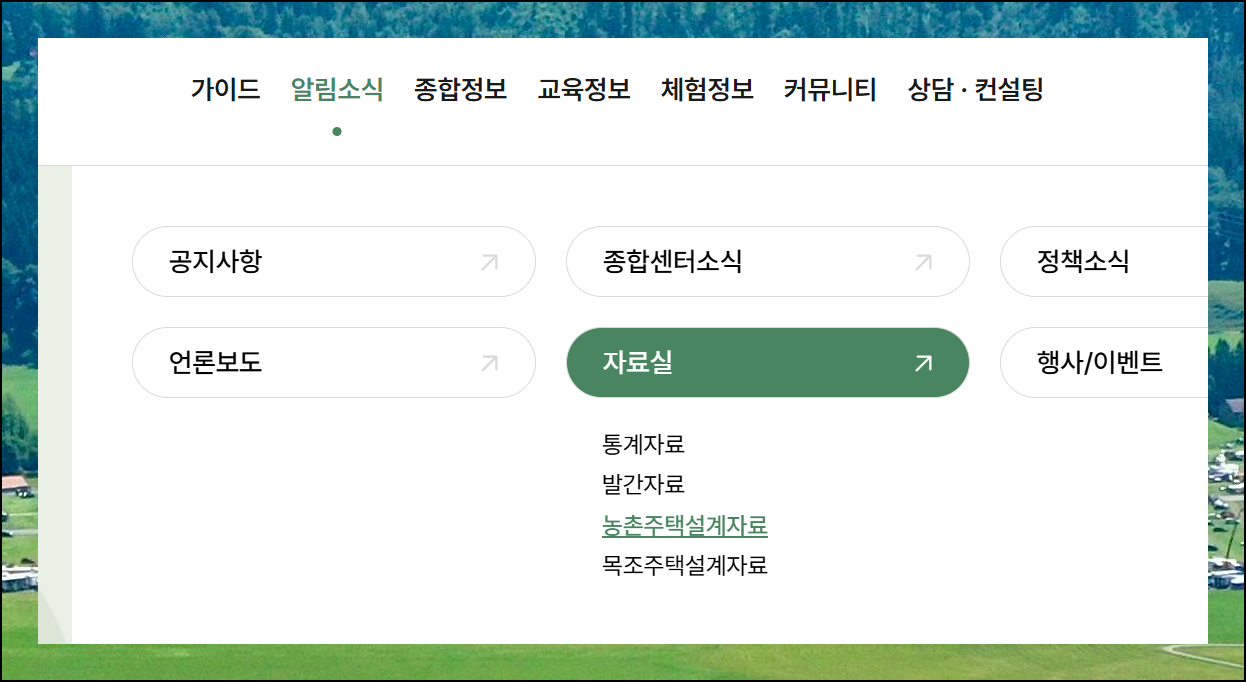 그린대로 사이트에 접속했어요. 이곳은 귀농귀촌 관련 정보나 용수시설 데이터를 얻기에 훌륭한 곳이에요. 농업 관련 지식을 쌓기에도 좋은 사이트라고 할 수 있습니다. 이곳에서 농가주택 표준설계도 파일을 받으려면 [알림 소식] 메뉴를 선택한 후 자료실 카테고리에 있는 [농촌주택설계자료]를 선택해 주세요.