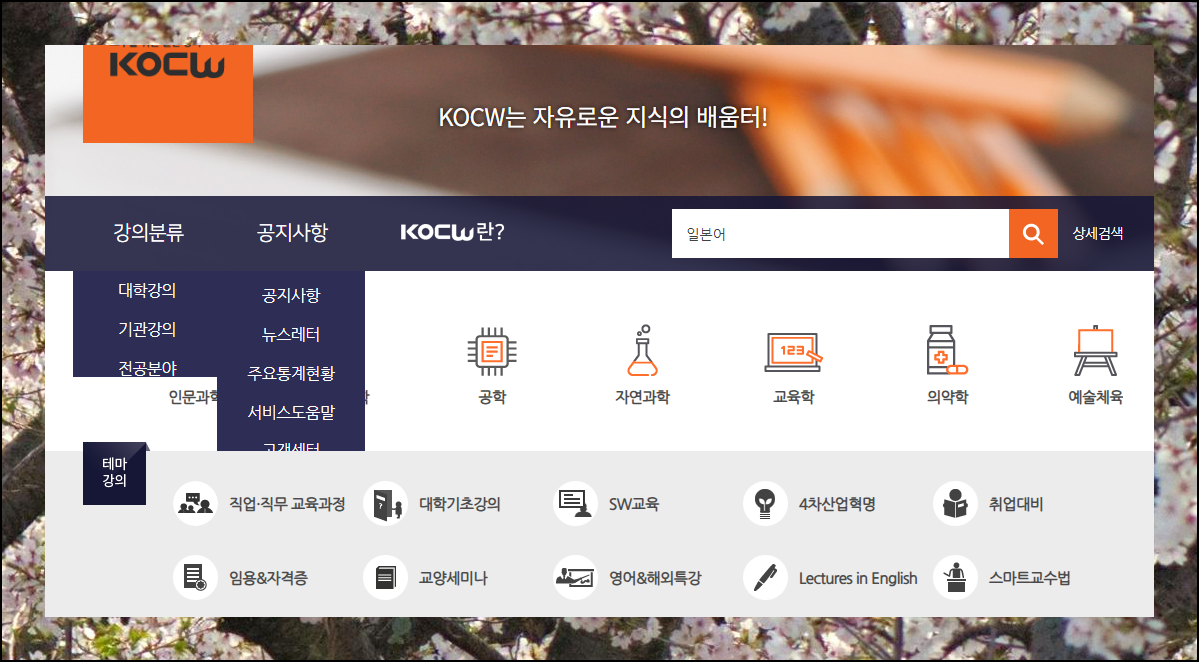 홈페이지 상단의 검색창에 "일본어"라고 입력하고 엔터키를 누르면 됩니다. 이렇게 간단한 방법으로 원하는 추천 강의를 빠르게 찾을 수 있어요. KOCW는 일본어뿐만 아니라 의약학, 자연과학, 공학 분야의 다양한 인터넷 수업도 제공하고 있습니다. SW교육이나 4차산업혁명 관련 최신 트렌드 강좌도 함께 살펴보시면 더욱 유익한 경험을 얻을 수 있을 거예요.