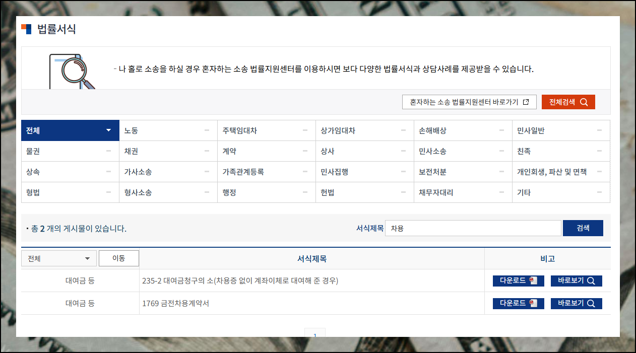 이곳에서 제공하는 법률서식 자료의 종류는 정말 방대해요. 노동 분야를 비롯해서 채권, 계약, 물권, 상속 등 다양한 법률 관련 서식들을 다운로드 받을 수 있는 곳입니다. 차용이라는 키워드로 검색하면 관련 문서를 쉽게 찾을 수 있어요.