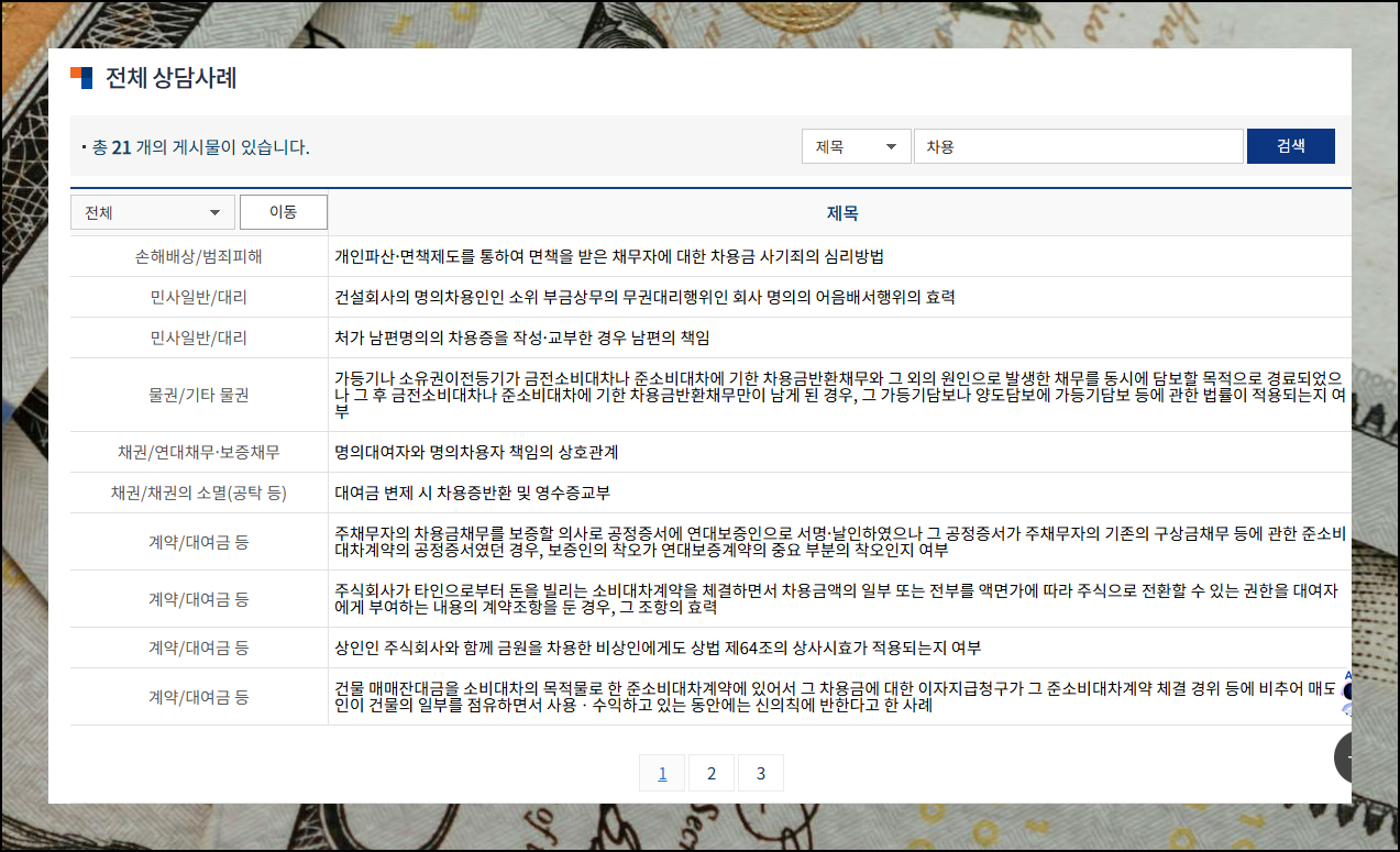 문제가 생겼을 때 법률구조공단의 상담 사례를 참고하는 것이 많은 도움이 된다고 말씀드렸는데요. 차용과 관련된 사례만 해도 여러 개나 되는데요. 사례 검색으로 해결되지 않는 문제가 있다면 사이버 상담이나 전화 상담을 통해서 전문적인 도움을 받을 수 있습니다.