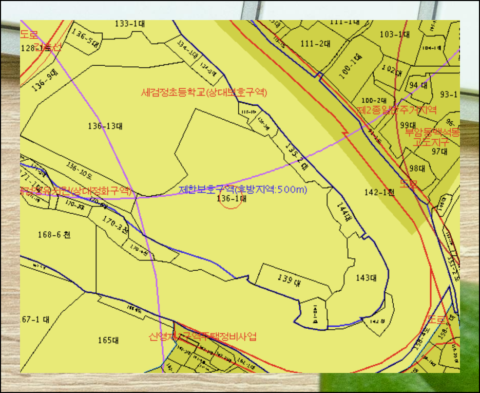 드디어 우리가 찾던 지적도가 화면에 나타났어요. 이 지도를 통해 해당 지역이 어떤 성격을 가지고 있는지 알 수 있어요. 도시지역인지, 주거지역인지, 특별한 규제가 있는 지역인지 한눈에 파악할 수 있습니다. 더 자세히 보고 싶다면 [도면 크게 보기] 버튼을 눌러보세요.