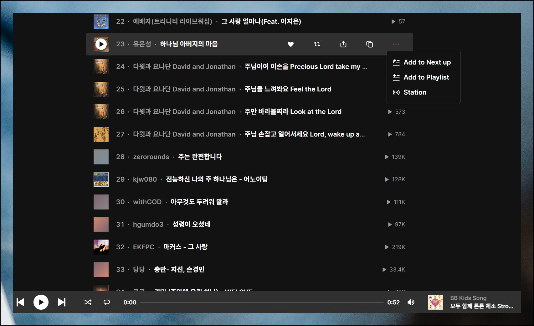 상세 페이지에서 화면을 아래로 내려보면 각 곡들의 제목이 나열되어 있어요. 특정 곡만 선택해서 들을 수도 있습니다. 각 곡 제목 우측에 점 3개로 된 메뉴 버튼이 있는데, 이를 클릭하면 나만의 복음성가 플레이리스트를 만들 수 있어요.