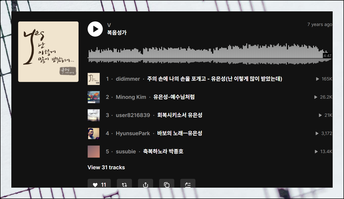 많은 사람들이 모르는 해외 무료 음악 플랫폼이 있습니다. "사운드클라우드"라는 서비스로, 외국에서는 정말 유명한 음악 스트리밍 사이트예요. 여기서 수많은 복음성가를 무료듣기로 감상할 수 있습니다. 국내 찬양곡은 물론이고, 전 세계적으로 유명한 CCM까지 다양하게 준비되어 있어요.