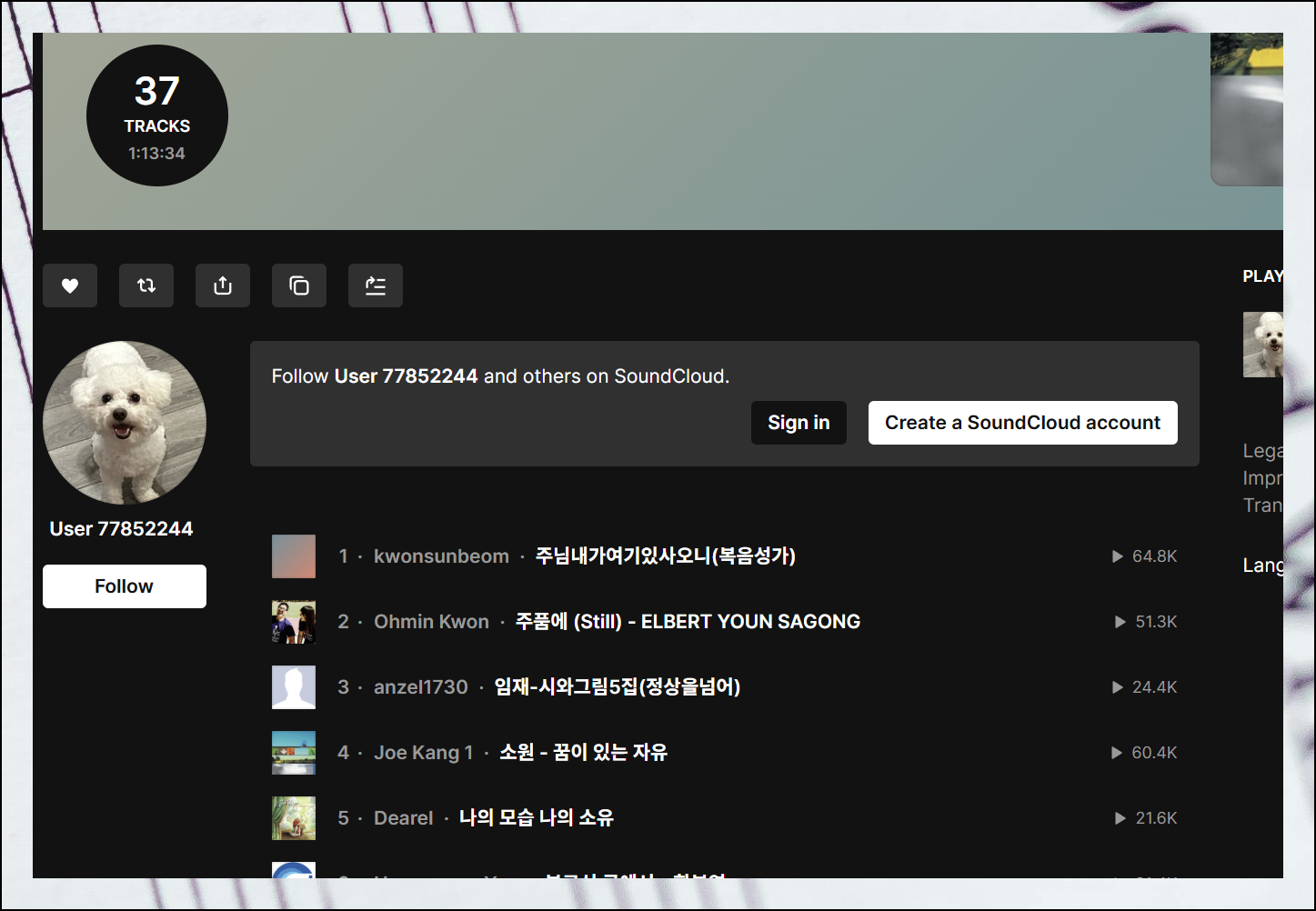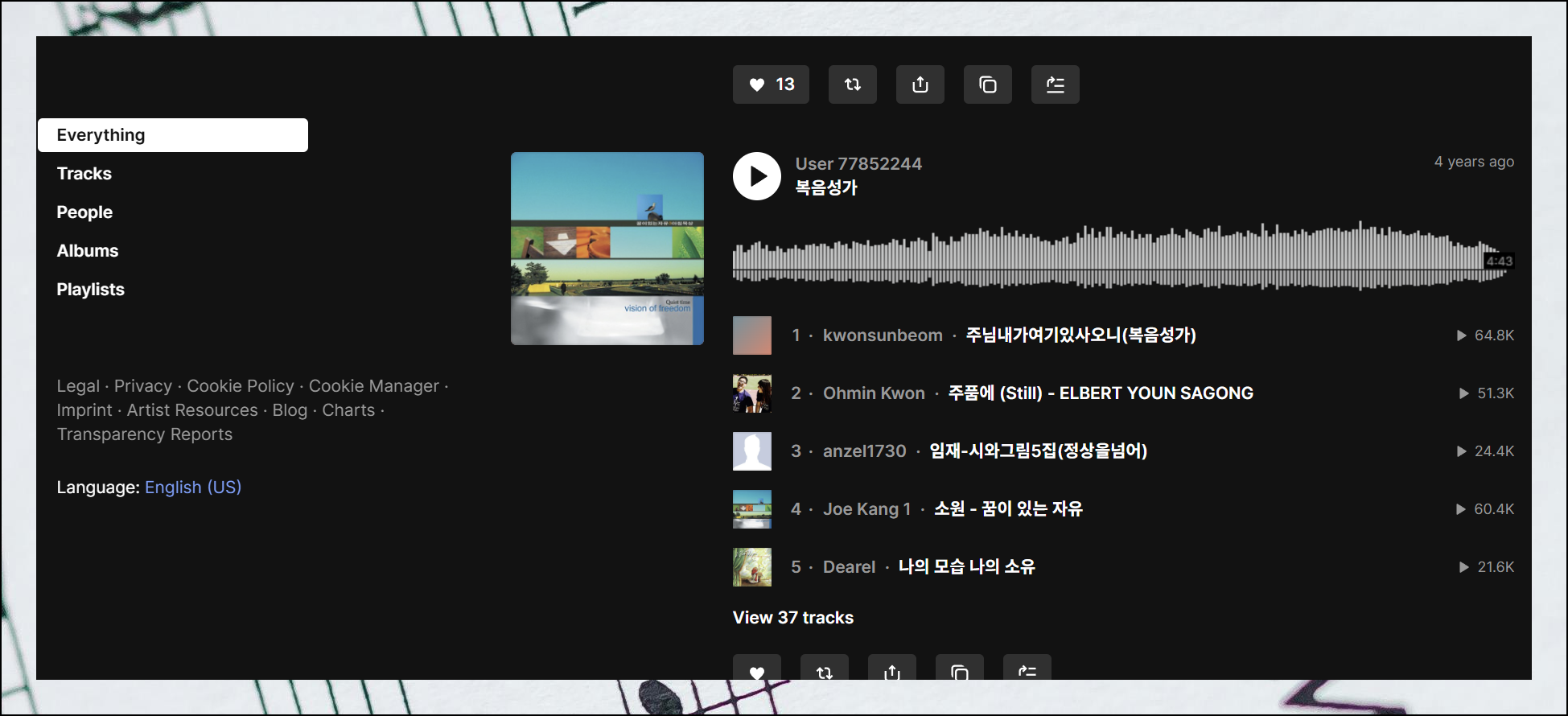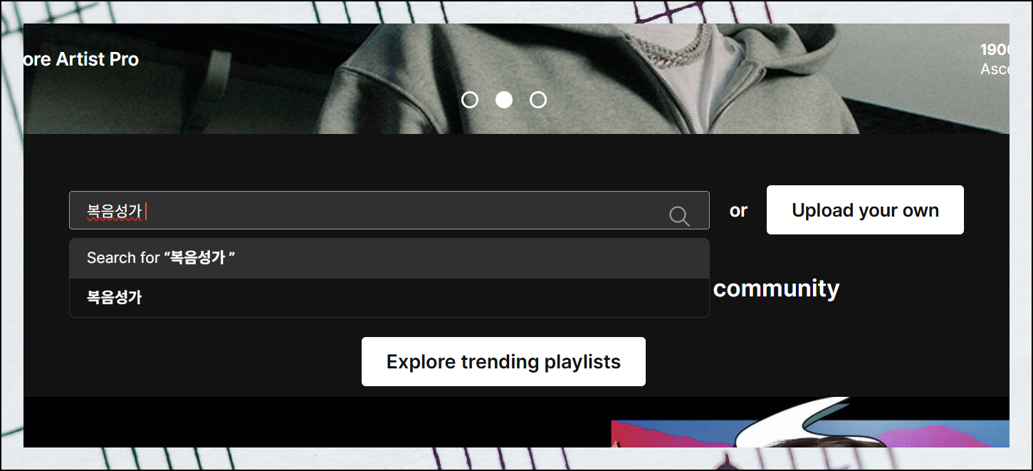 사운드클라우드 홈페이지에 접속하면 상단에 검색창이 보입니다. 여기에 복음성가나 복음송을 입력하고 검색해보세요. 화면에 "Sign up for free"라는 버튼이 나타나면 클릭해보세요. 이 버튼을 통해 무료 회원가입을 진행할 수 있어요. 회원가입을 완료하고 로그인하면 들었던 곡들의 히스토리가 자동으로 저장되고, 개인 플레이리스트도 만들 수 있거든요.