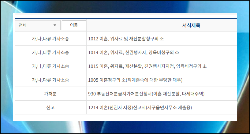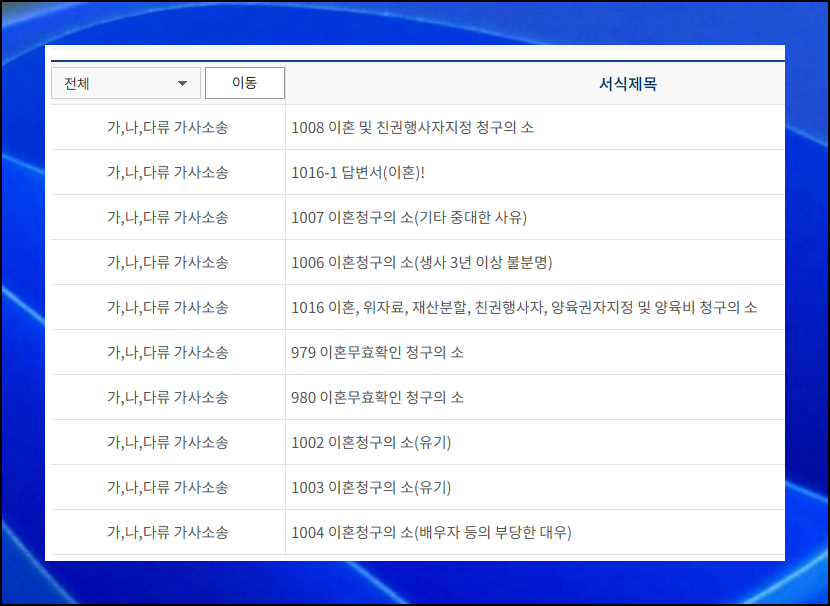 법률서식 페이지에 들어가시면 검색창이 보입니다. 여기서 이혼 관련 키워드로 검색해보세요. 다양한 관련 서식들이 검색 결과로 나타날 거예요. 그 중에서 협의이혼 신청서를 찾아 선택하시면 됩니다.