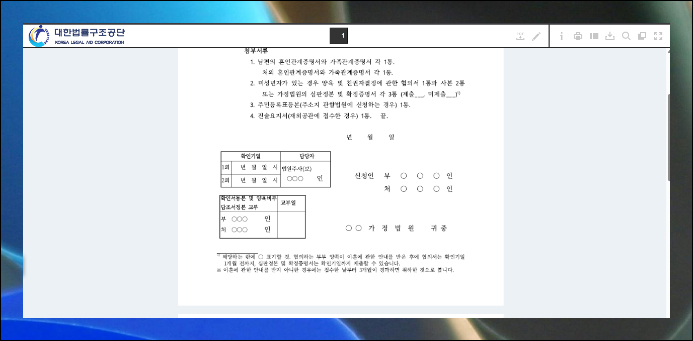다운로드하기 전에 올바른 서식인지 한 번 더 확인해보세요. 신청서 하단에는 함께 제출해야 하는 첨부서류 목록이 자세히 나와 있습니다. 혼인관계증명서, 가족관계증명서 등이 포함되어 있어요. 바로보기 기능을 이용하면 브라우저에서 직접 서식의 전체 구성을 미리 볼 수 있습니다.
