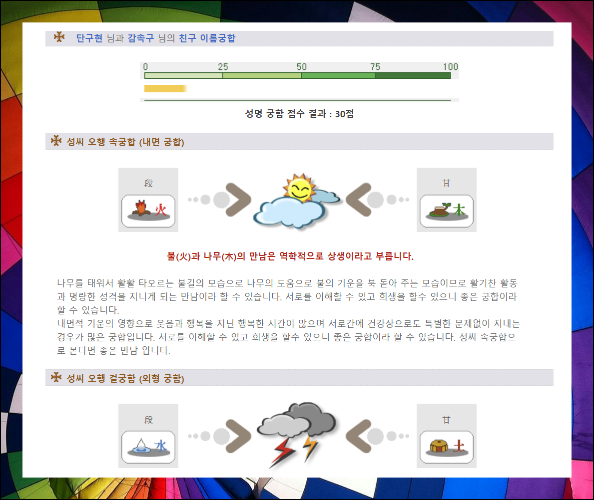친구나 연인과의 궁합보기를 통해 재미있으면서도 의미 깊은 해석을 받아볼 수 있어요. 성씨와 이름이라는 간단한 정보만으로도 놀랍도록 풍부하고 흥미로운 이야기를 들려주는 무료 서비스입니다.