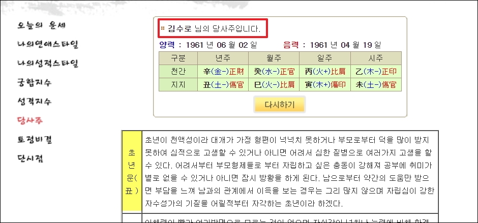 ▼제가 운세 보는곳이 몇 군데 있습니다. 그 중에서 당사주 전문인 곳이 있는데, 이곳을 통해 퀄리티 높은 풀이를 만나볼 수 있습니다. 당사주의 경우 초년운, 중년운, 말년운, 총운을 통해 나의 인생에 대하여 총체적으로 알려줍니다. 평생에 걸친 운을 설명해 준다고 할 수 있죠.