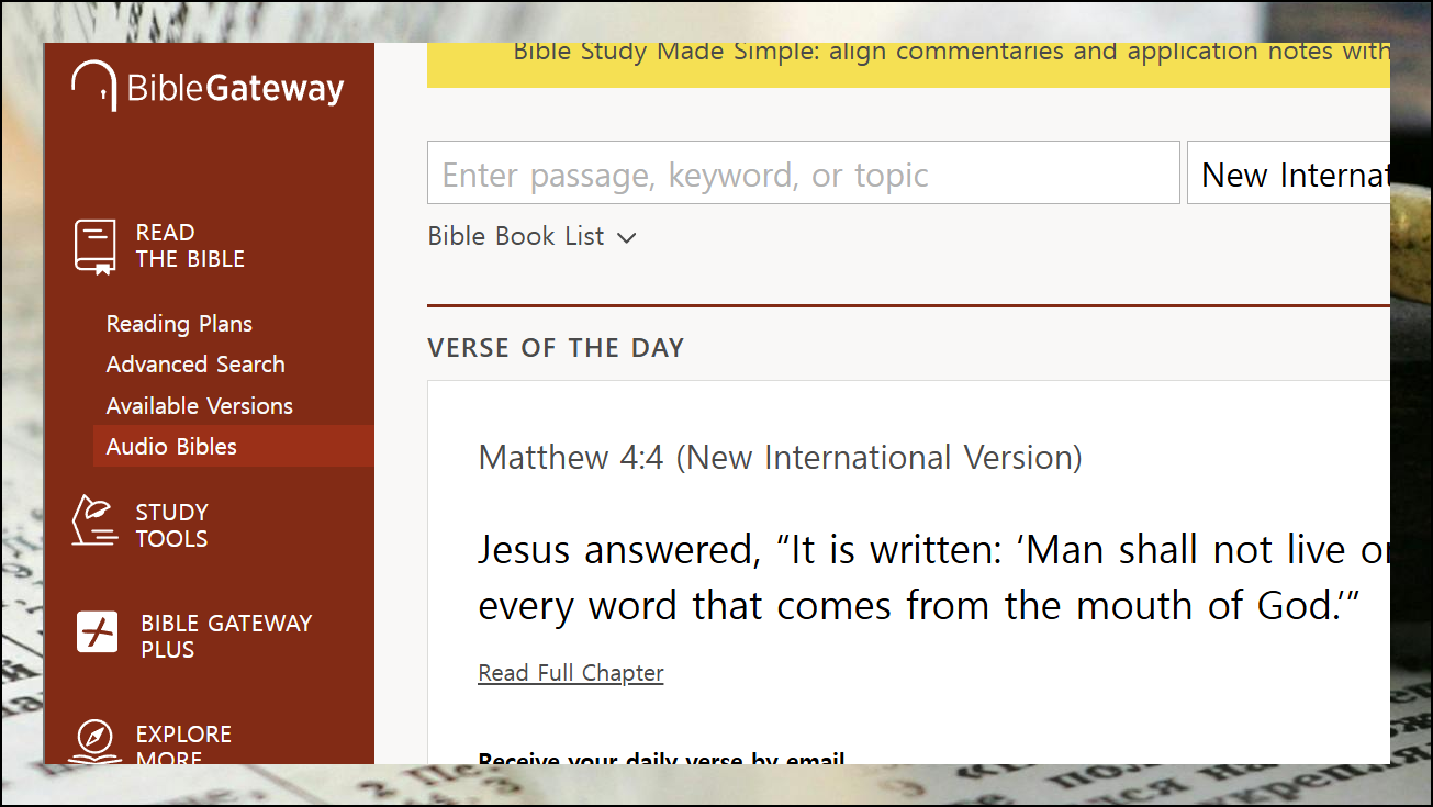 Bible Gateway에 접속하면 날마다 새로운 성경 구절이 메인 화면에 표시됩니다. 이 구절들을 읽는 것은 물론이고, 음성으로도 듣기 가능해요. 매일 다른 말씀을 만나볼 수 있어서 정말 유익합니다.