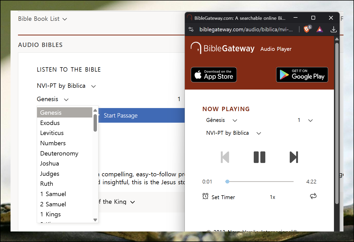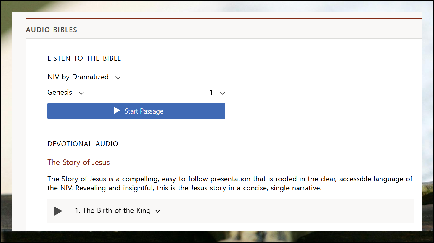 새로운 페이지가 열리면 "Start Passage" 버튼이 나타납니다. 이 버튼을 누르면 성경 듣기 서비스가 즉시 재생이 되는데요. 처음부터 끝까지 잘 들립니다.