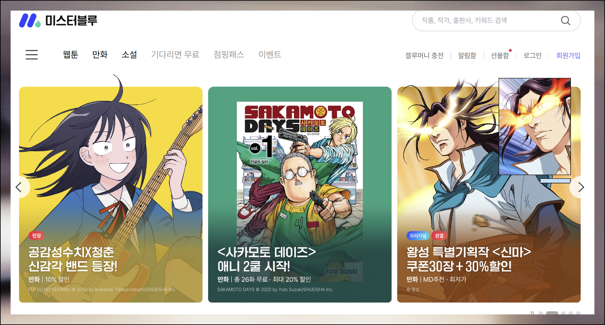 미스터블루는 웹툰과 만화, 소설 등 여러 장르의 콘텐츠를 제공하는 종합 엔터테인먼트 플랫폼이에요. 황성 작가의 작품을 포함한 다양한 무료 만화 이벤트를 정기적으로 진행합니다. 사이트에 접속한 후 화면 상단의 '만화' 메뉴를 클릭해보세요.