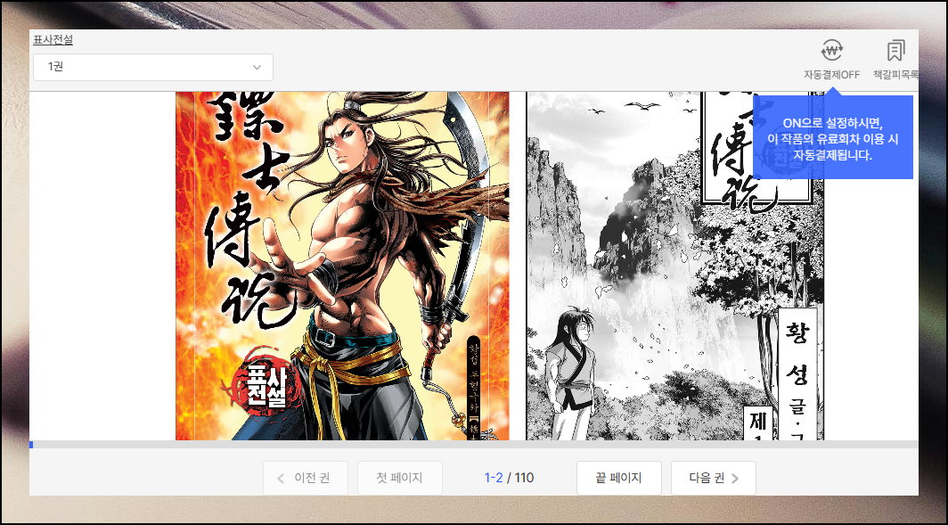 '대여' 탭을 선택하면 원하는 권수를 직접 골라서 볼 수 있어요. 특정 권부터 읽고 싶을 때 매우 유용한 기능입니다. "정액제"를 이용하면 저렴한 금액으로 황성 작가의 작품을 처음부터 끝까지 모두 감상할 수 있어요.