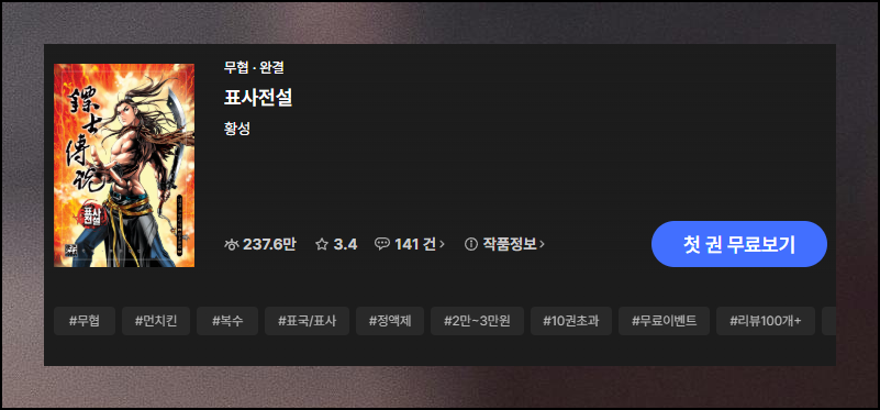 표사전설을 선택하면 별점 3.4점으로 독자들의 호평을 받고 있음을 확인할 수 있어요. 조회수는 237.6만회로 엄청난 인기를 자랑하는 만화입니다. 작품 페이지에서 '첫 권 무료보기' 버튼을 누르면 즉시 감상을 시작할 수 있어요.