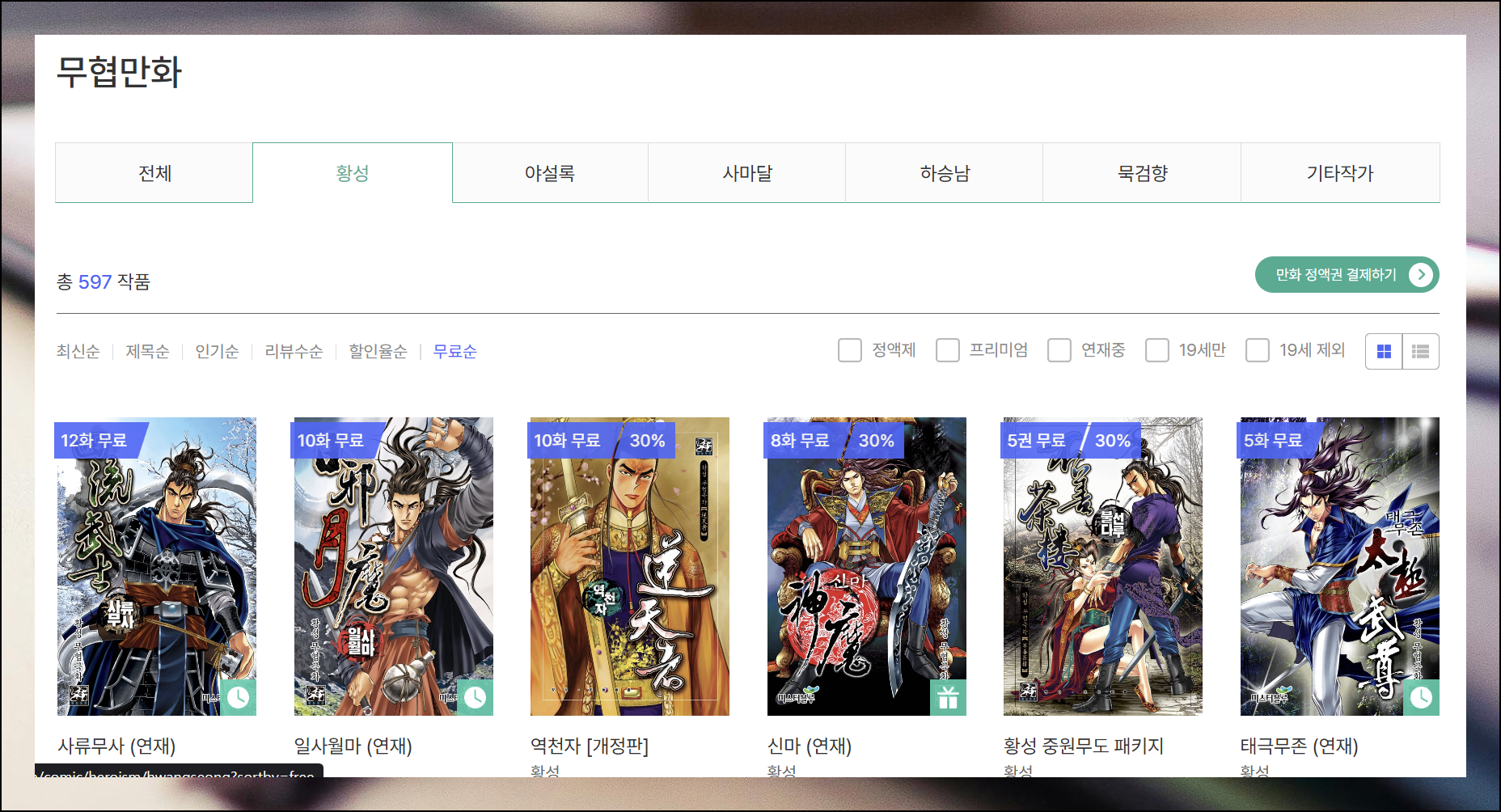만화 메뉴에 들어가면 무협관과 특별관 등 다양한 섹션으로 나뉘어 있어요. '지금 무료' 버튼을 클릭한 다음 무협 섹션에서 황성 작가를 검색해보세요. 하승남, 묵검향, 사마달, 야설록 등 유명한 무협 작가들의 무료 작품도 함께 찾을 수 있습니다.