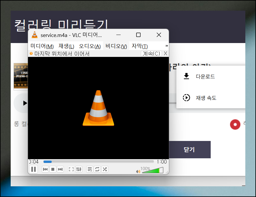 앞서 말한 아이콘을 누르면 [다운로드] 옵션이 나타나요. 이 메뉴를 선택하면 음원 파일을 무료로 저장할 수 있어요. 받은 파일을 음악 앱으로 실행해보니 미리듣기에서 들었던 것과 동일한 음악이 재생되었어요. 이런 방식으로 핸드폰 컬러링을 무료로 받을 수 있습니다. 생각보다 어렵지 않으니 제가 설명한 순서대로 차근차근 시도해보세요.