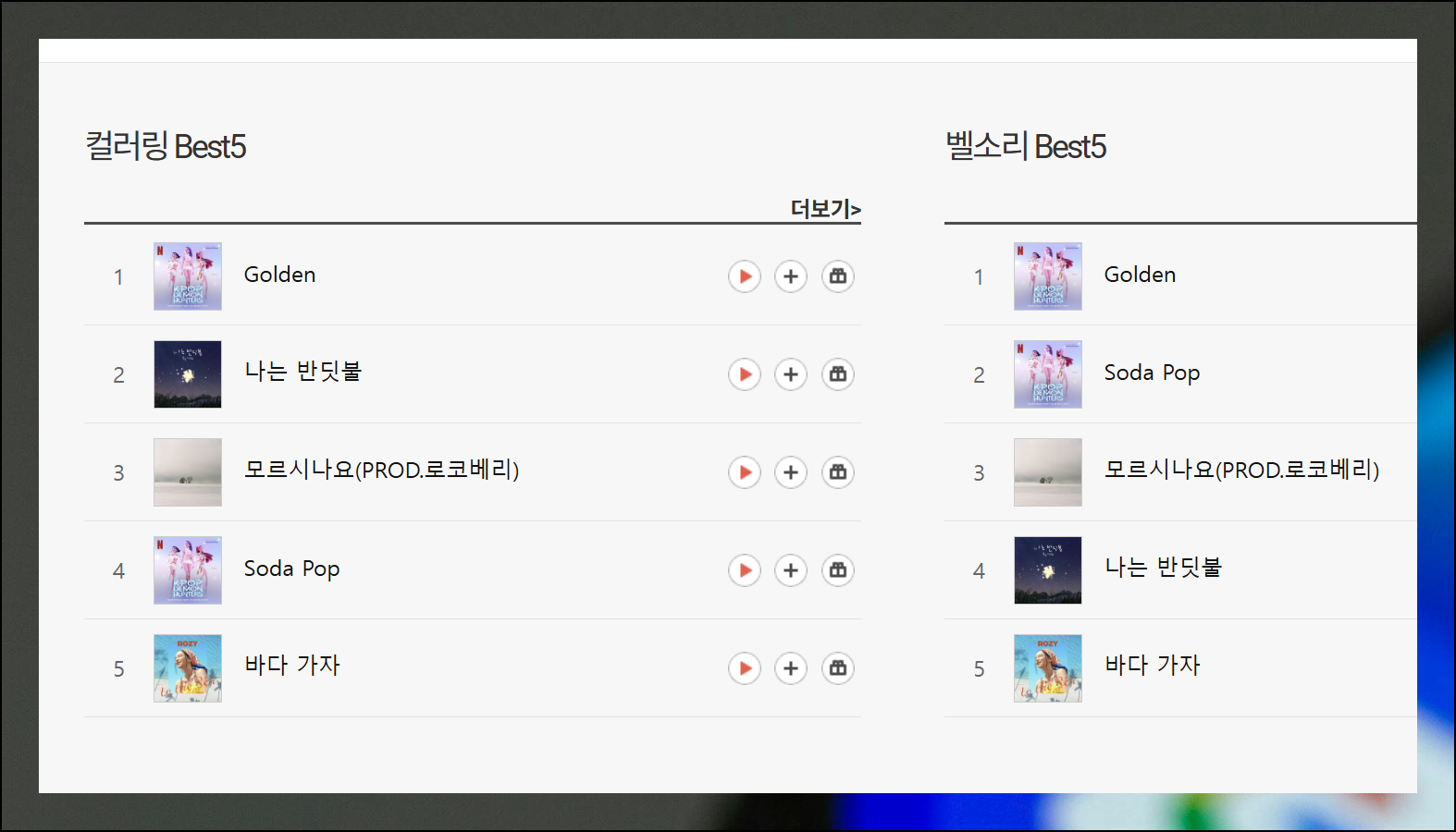 티월드 홈페이지에 들어갔다면 상단 메뉴를 살펴보세요. [상품서비스] → [모바일 전용 서비스] → [핸드폰 컬러링 / 벨소리] 이 순서로 클릭하면 됩니다. 그러면 현재 가장 인기 있는 음원 Best 5 목록이 보일 거예요.