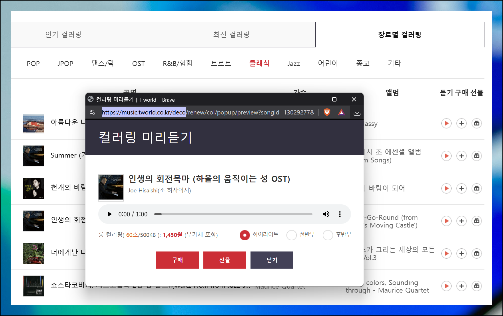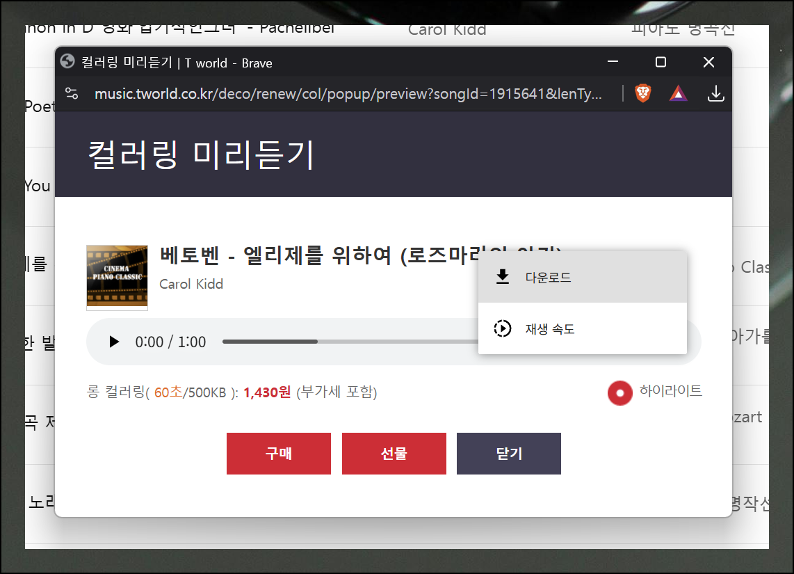 클래식 장르 인기 음원을 찾아보았어요. 특정 음원의 [재생] 버튼을 클릭하니 [핸드폰 컬러링 미리듣기] 창이 떴어요. 이 화면에서 재생 버튼을 다시 한 번 누르면 무료로 들어볼 수 있어요. 오디오 파일을 내려받고 싶다면 재생바 오른쪽 끝에 있는 [점 3개] 아이콘을 클릭해보세요.