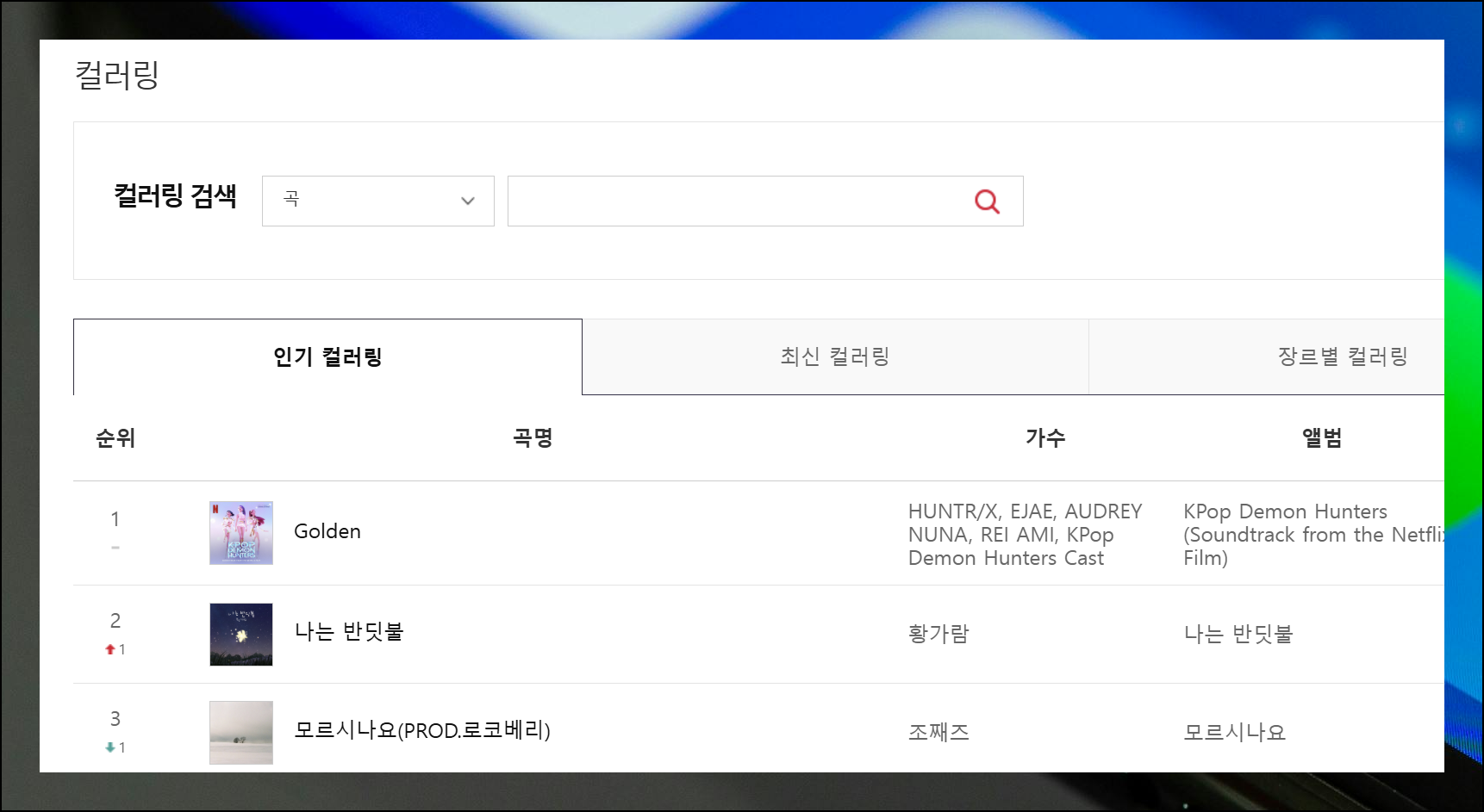 새로 열린 화면에서는 좋아하는 노래를 직접 찾아볼 수 있어요. 그 곡으로 제작된 컬러링 음원을 쉽게 찾을 수 있습니다. 노래 제목, 아티스트 이름, 앨범 제목 총 3가지 방식으로 검색이 가능해요. 검색 박스 아래쪽에는 인기곡, 신곡, 장르별 히트곡 목록이 정리되어 있으니 마음에 드는 걸 골라보세요.