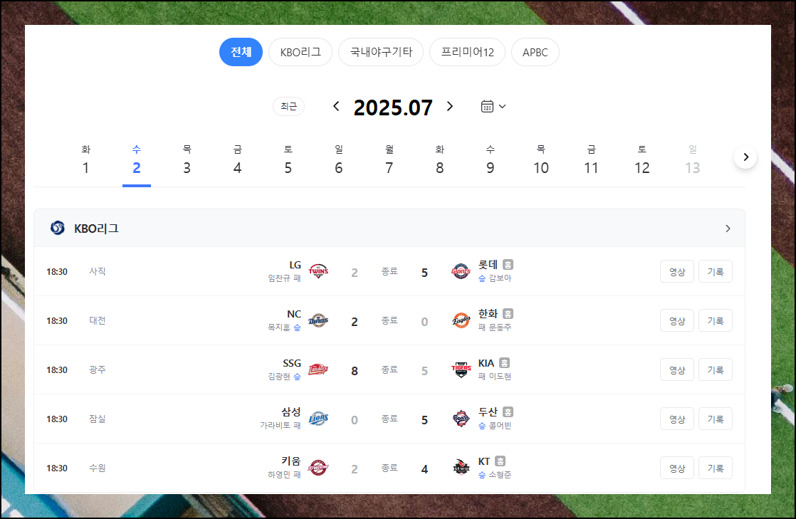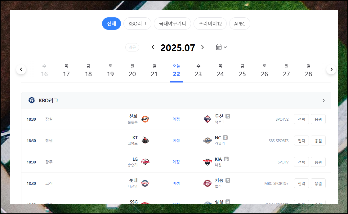 상단 메뉴에서 야구 항목을 선택한 후 일정 페이지로 이동하면 원하는 경기를 쉽게 찾을 수 있어요. 종료된 경기에 대한 영상들도 계속 보관되어 있어서 언제든 방송보기 가능합니다. 초보자도 금방 익숙해질 수 있도록 사용하기 편한 화면으로 구성되어 있어요.