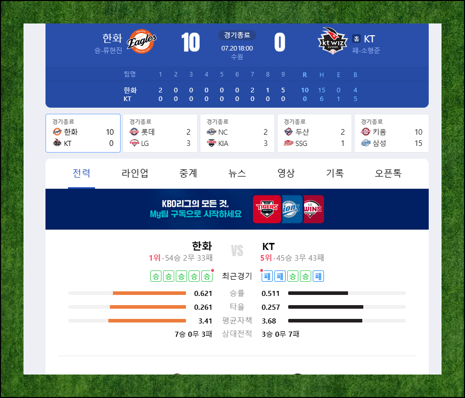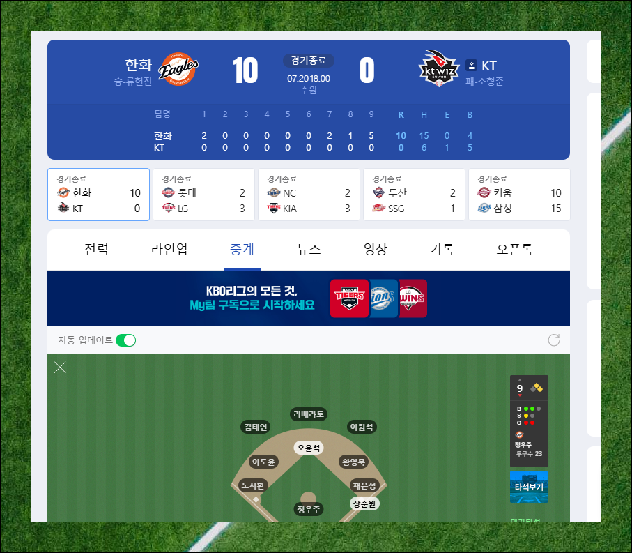 텍스트 중계 서비스로 야구 진행 상황을 실시간으로 확인할 수 있어요. 선수 개인 기록과 팀별 성적, 리그 순위 등 다양한 통계를 한 화면에서 모두 파악 가능합니다. 중계 알림을 설정해두면 중요한 순간들을 놓치지 않고 지속적으로 상황을 체크할 수 있어요.