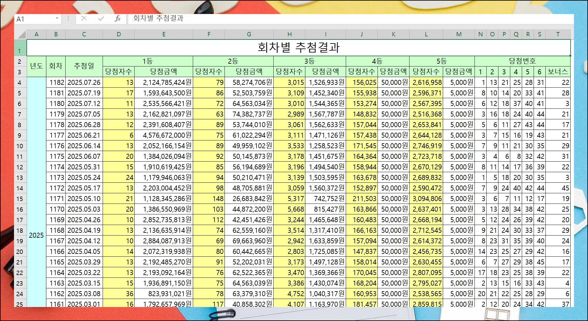최근까지 모든 로또당첨번호 추첨 기록을 통합해서 살펴볼 수 있어요. 추첨일자와 당첨자 현황, 상금 정보까지 체계적으로 정리된 자료를 확인할 수 있습니다. 엑셀로 제공되어 원하는 방식으로 편집하고 가공하기 편리해요.