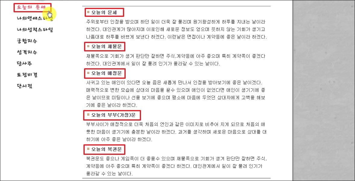 ▼마지막으로 나의 하루 운에 대해 자세히 알려주는 [오늘의 운세]를 이용해 보겠습니다. 보는법은 당사주 서비스와 동일합니다. 이곳에서는 다른 곳에 비해 풀이 내용이 상세한 편입니다. 일반적인 오늘의 운세와 더불어 재물운, 애정운, 부부운, 복권운을 알려줍니다.