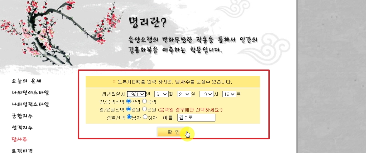 ▼이곳에서 당사주 보는법을 알려드리겠습니다. 일단 좌측에 있는 [당사주] 메뉴를 선택합니다. 그럼 몇 가지 정보를 입력해야 페이지가 나타납니다. 여기에서 생년월일시,성별, 이름을 입력합니다. 양력, 음력, 평달, 윤달 여부도 꼼꼼하게 입력해야 정확한 풀이를 만나보는 것이 가능합니다.