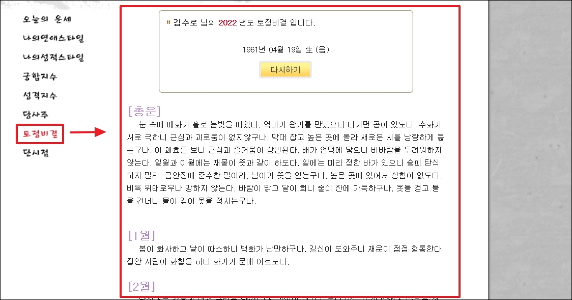 ▼이번에는 많은 사람들에게 인기 있는 역술 중 하나인 토정비결을 보도록 하겠습니다. 토정비결의 경우 나의 한해 운세에 대한 것을 알려줍니다. 2022년 총운과 더불어 2022년 1월부터 12월에 해당하는 월별 세운을 확인할 수 있습니다. 매년 그리고 매월마다 나에게 어떤 운이 들어오는지 알고 싶을 때 사용하면 좋습니다.