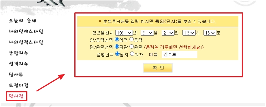 ▼이곳에서는 당사주 말고도 볼만한 역술 서비스가 많습니다. 이번에는 단시점 보는법을 알려드리겠습니다. 앞서 입력한 정보를 반복해서 입력할 필요는 없습니다. 한 번 역술 서비스를 이용하면 해당 정보는 자동으로 입력이 됩니다. 우리는 [확인] 버튼만 누르면 됩니다.