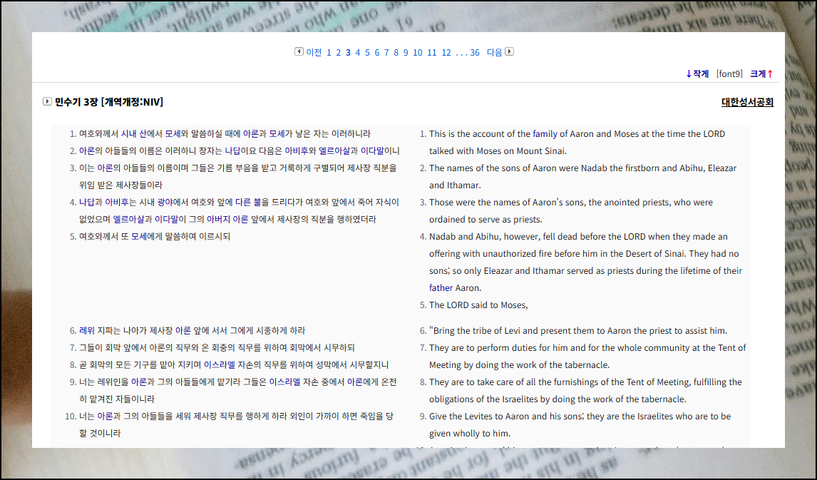 말씀으로 영어 학습을 병행하고 싶은 분들에게 좋은 기능이 있습니다. 메뉴에서 대역 옵션 중 NIV, KJV, NASB 중 하나를 선택해보세요. 그럼 화면 좌측에는 한국어 본문이, 우측에는 영어 본문이 동시에 나타나요. 영어 성경 읽기를 훨씬 쉬운 방식으로 만들어주는 훌륭한 기능입니다.