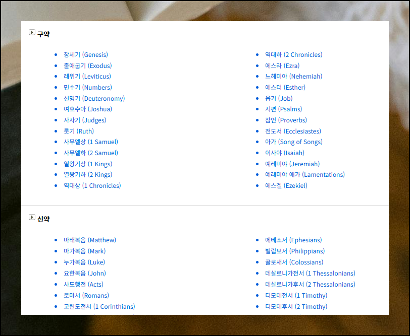 한국어 번역본 중에서 원하는 것을 골라봤어요. 화면에는 구약과 신약의 전체 챕터 목록이 나타나는데요. 성경에서 읽고 싶은 챕터를 클릭하면 즉시 해당 내용을 확인할 수 있습니다. 중요한 용어들은 파란색 굵은 글씨로 강조되어 있어서 쉬운 이해가 가능해요.